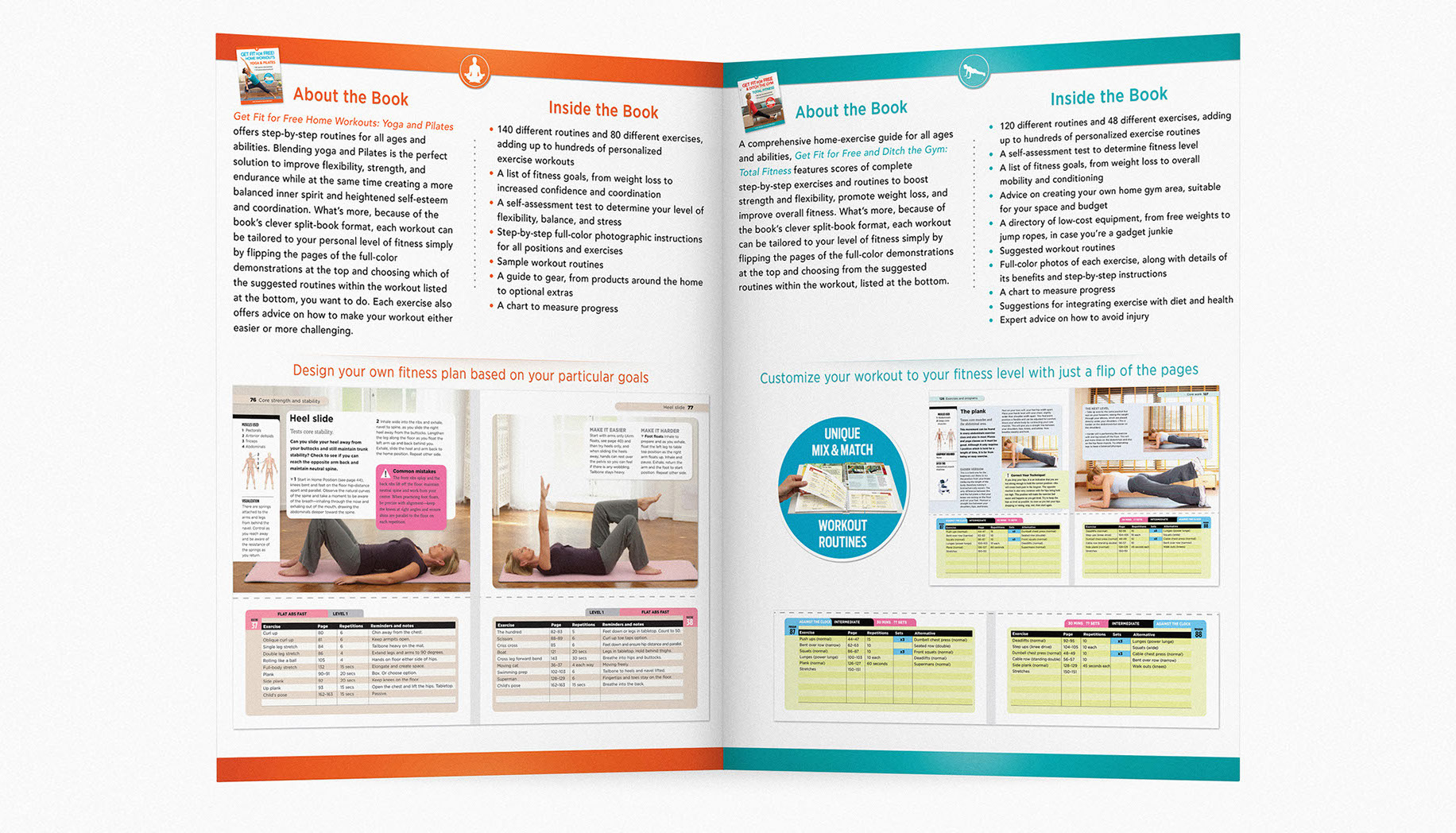 I was asked to create this brochure for a book series that offers step-by-step fitness routines. The brochure features sample spreads and contains information about the books, their authors and marketing efforts.